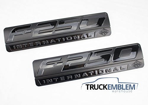 2 NEW (PAIR) SET CUSTOM MATTE BLACK F250 POWERSTROKE FORD INTERNATIONAL FENDER BADGES EMBLEMS